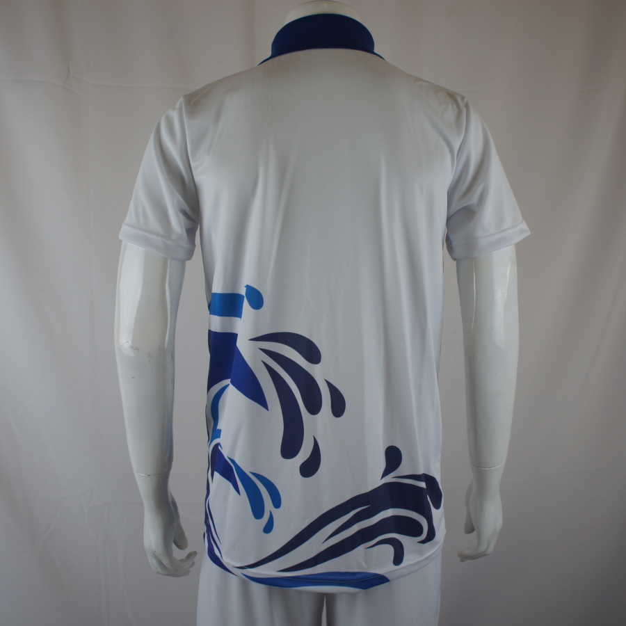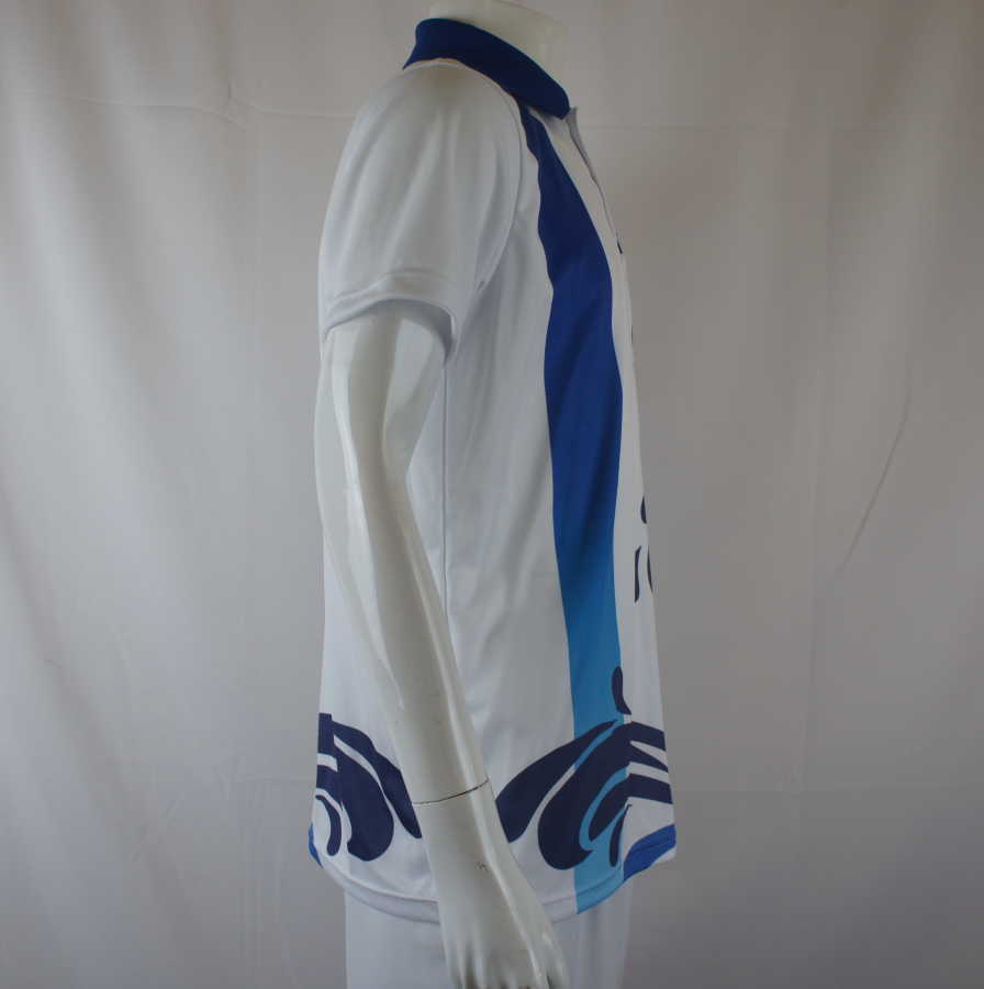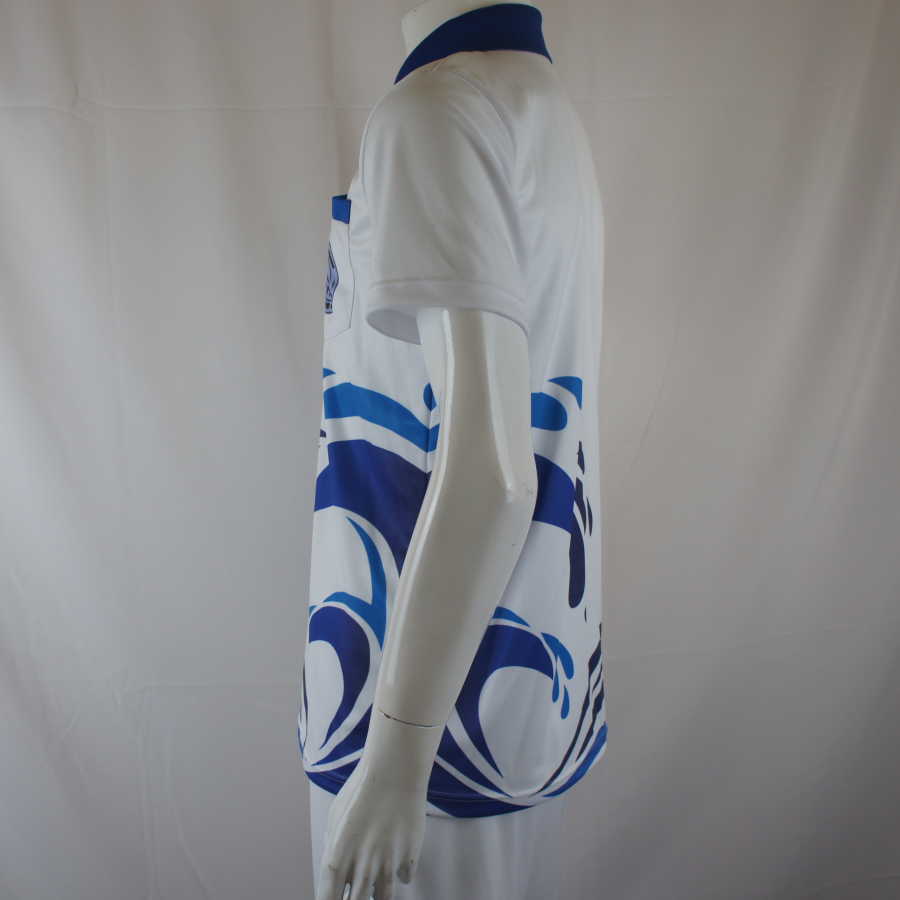 ภาพนี้แสดงให้เห็นถึงดีไซน์ด้านหน้าของเสื้อโปโลที่ผลิตด้วยระบบพิมพ์ลาย ซับลิเมชั่น ซึ่งช่วยให้ลวดลายกราฟิกหยดน้ำและแถบสีน้ำเงินมีความต่อเนื่องและสวยงามประณีต Sport Mighty เราให้ความสำคัญกับเนื้อผ้าเป็นพิเศษ โดยเลือกใช้ผ้า ไมโครโพลีเอสเตอร์ ที่มีโครงสร้างแบบตาข่ายหรือรังผึ้ง (Honeycomb) เพื่อการระบายอากาศที่ดีเยี่ยม มอบสัมผัสที่นุ่มสบายผิวให้กับนักเรียนที่สวมใส่ นอกจากนี้เรายังมีขนาดไซส์ที่ครอบคลุมตั้งแต่นักเรียนตัวเล็กไปจนถึงไซส์พิเศษขนาดใหญ่ รวมถึงมีแพทเทิร์นเฉพาะสำหรับผู้หญิงเพื่อให้สวมใส่ได้ทรงที่สวยงามและมั่นใจในทุกการเคลื่อนไหวระหว่างทำกิจกรรม